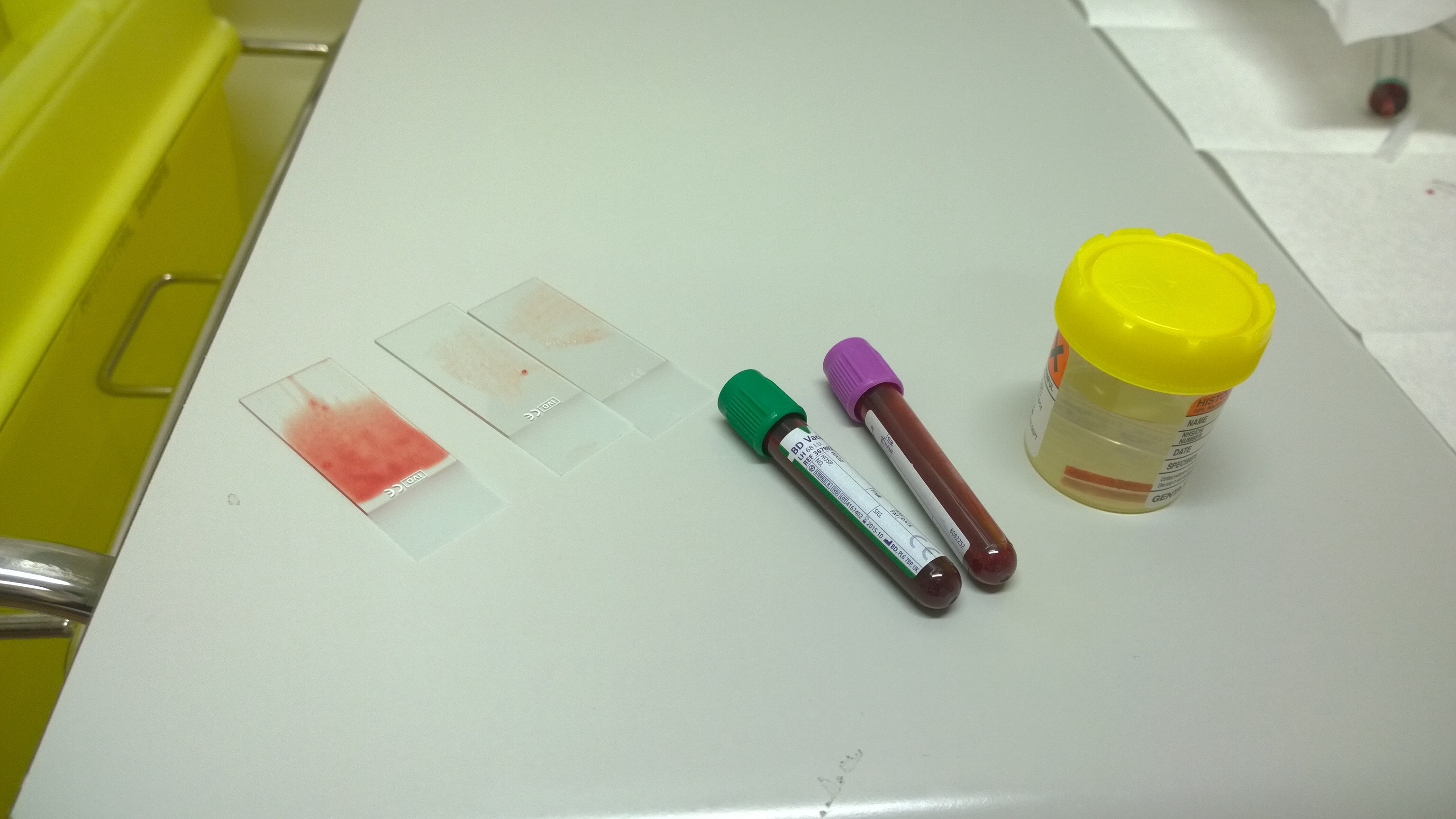 at this point, the nurse also prepared some slides so that the liquid can be assessed under the microscope. What he’s looking for here is lumps of bone marrow which can sometimes be mixed in with the blood.