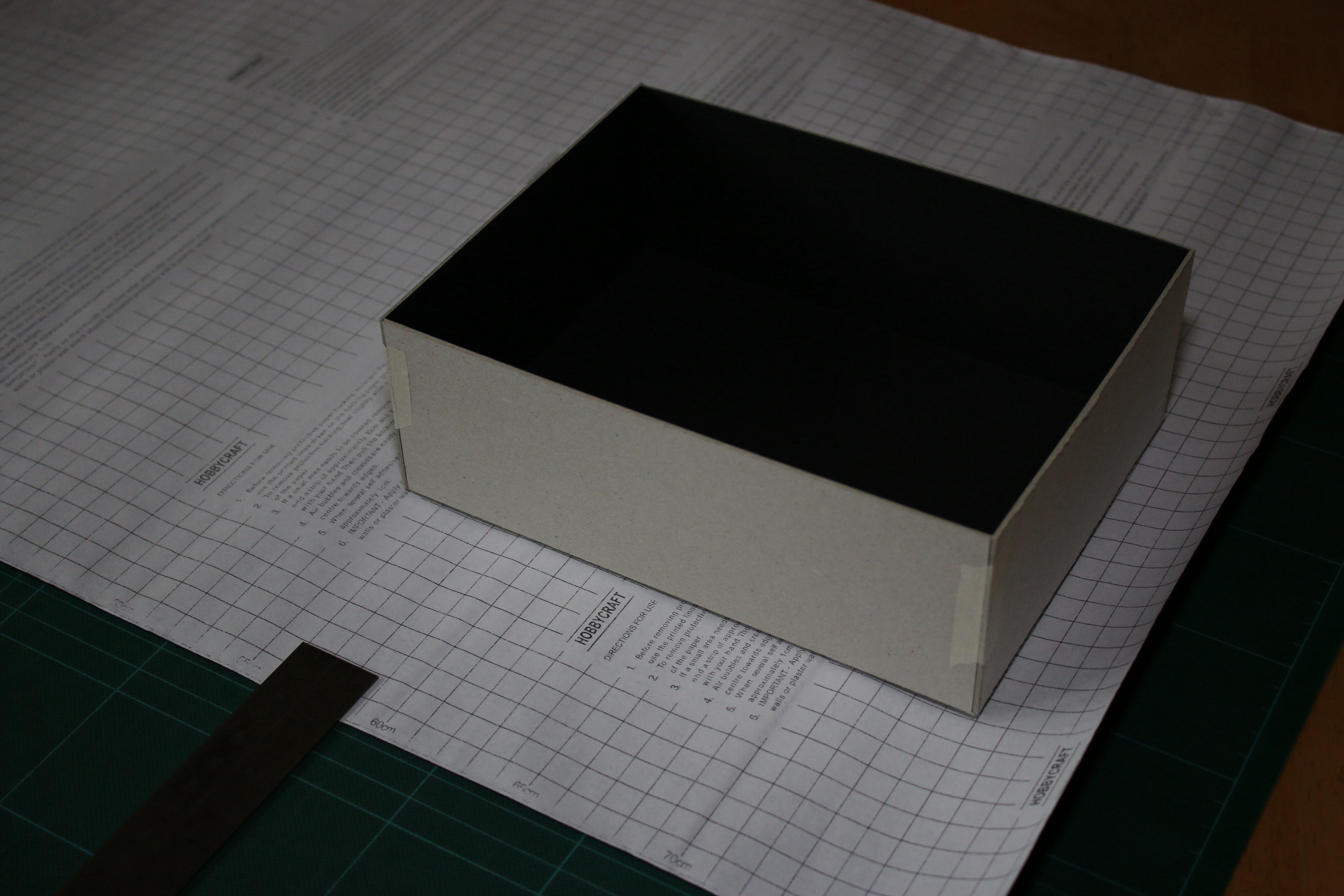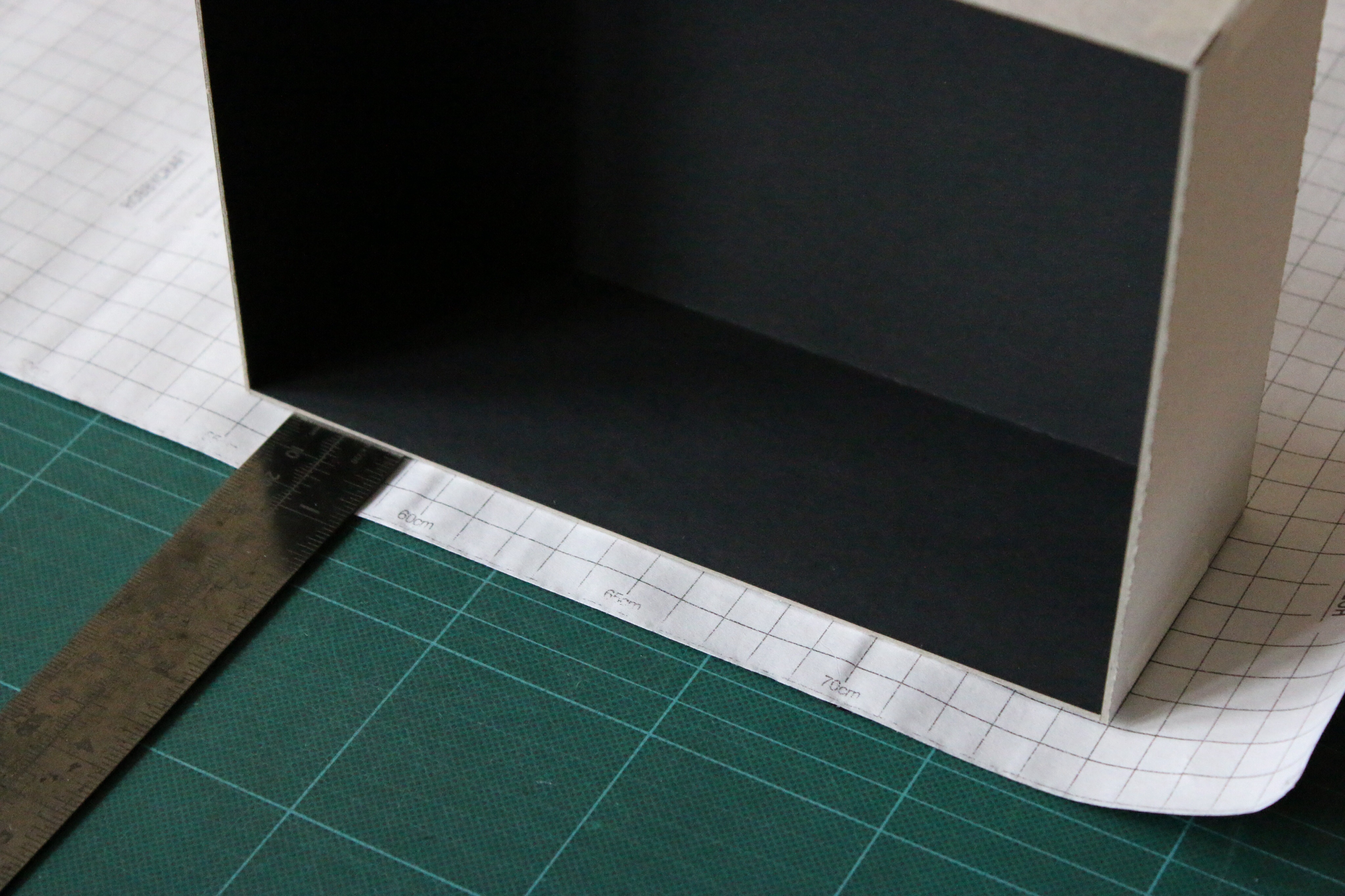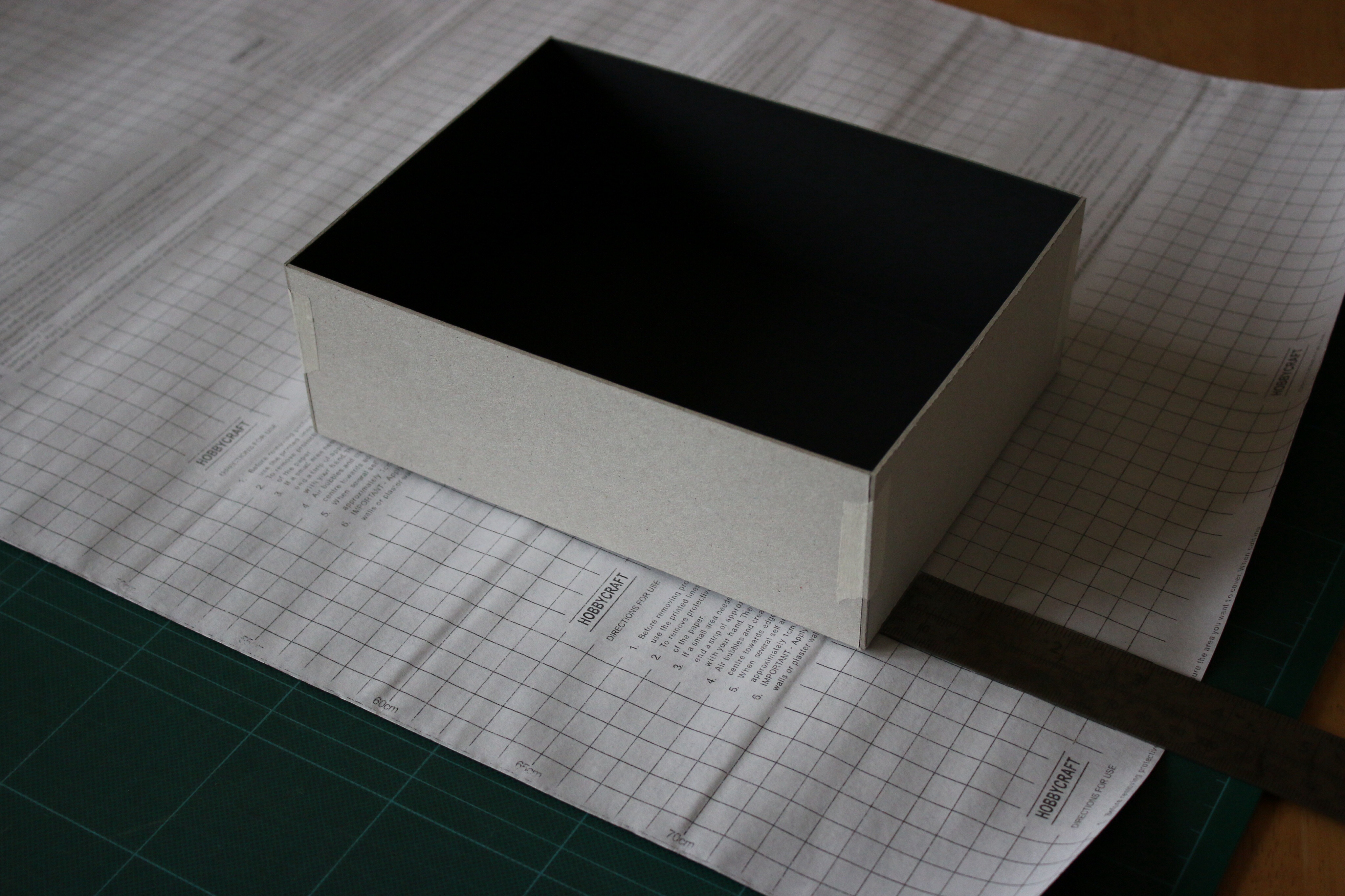 A sheet of Rigid pulp board: I’m using a grey board which has a black coating on one side. The material needs to be between 1 & 2mm thick (1000-2000mic or 0.04-0.08″). One side of the board will be visible on the inside, so you can coat this or use a coloured or pre-coated material as I am, but these boards can be expensive so a solid grey or display board can also be used.