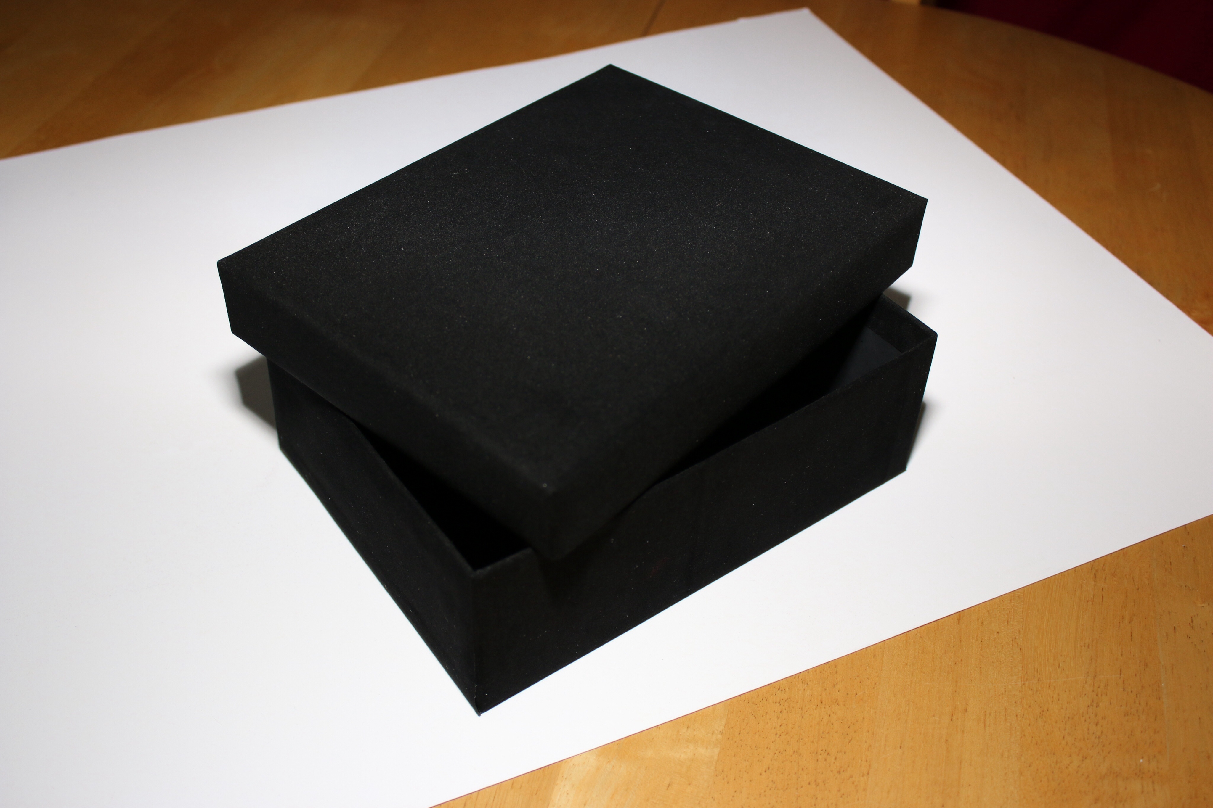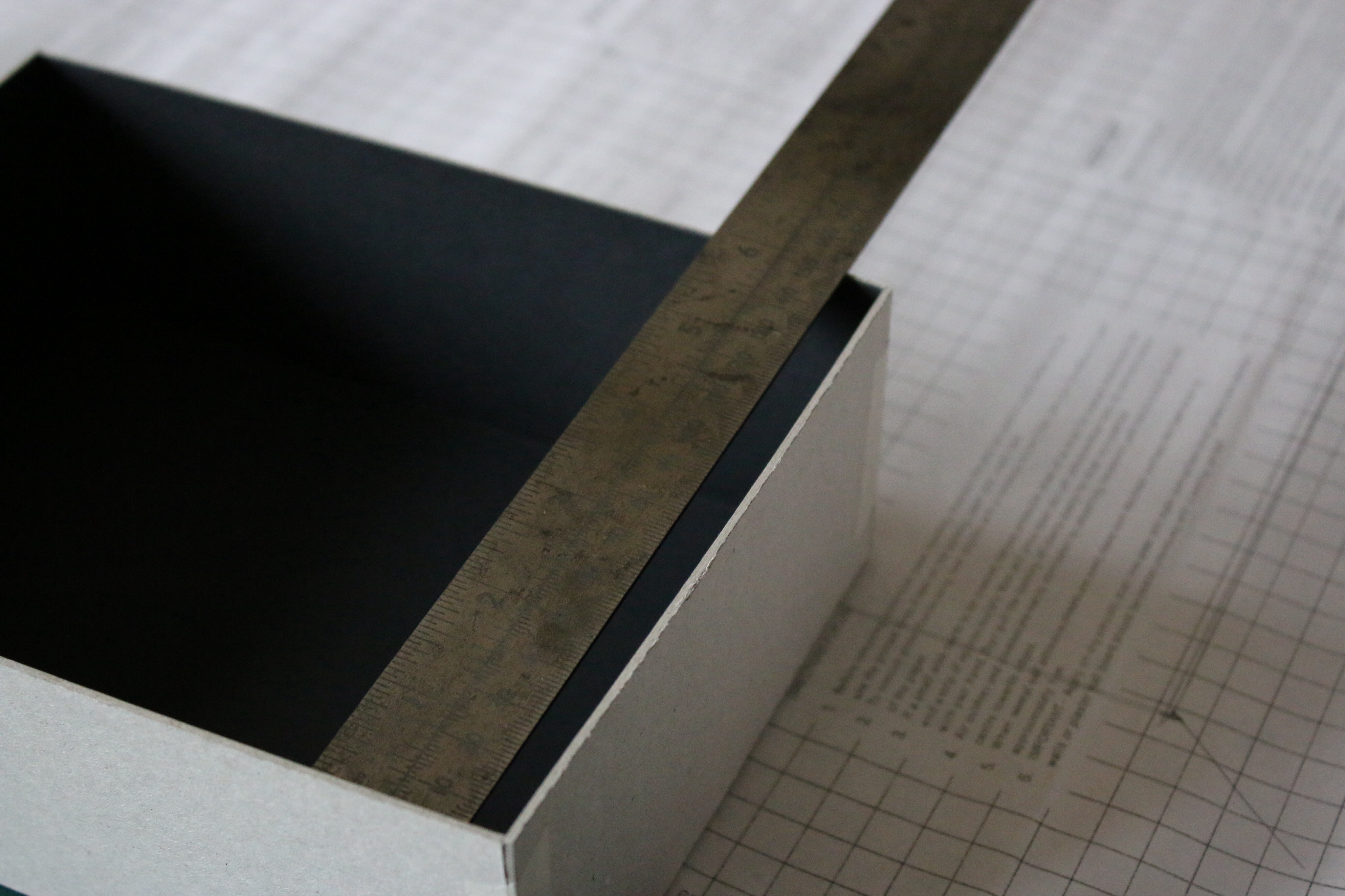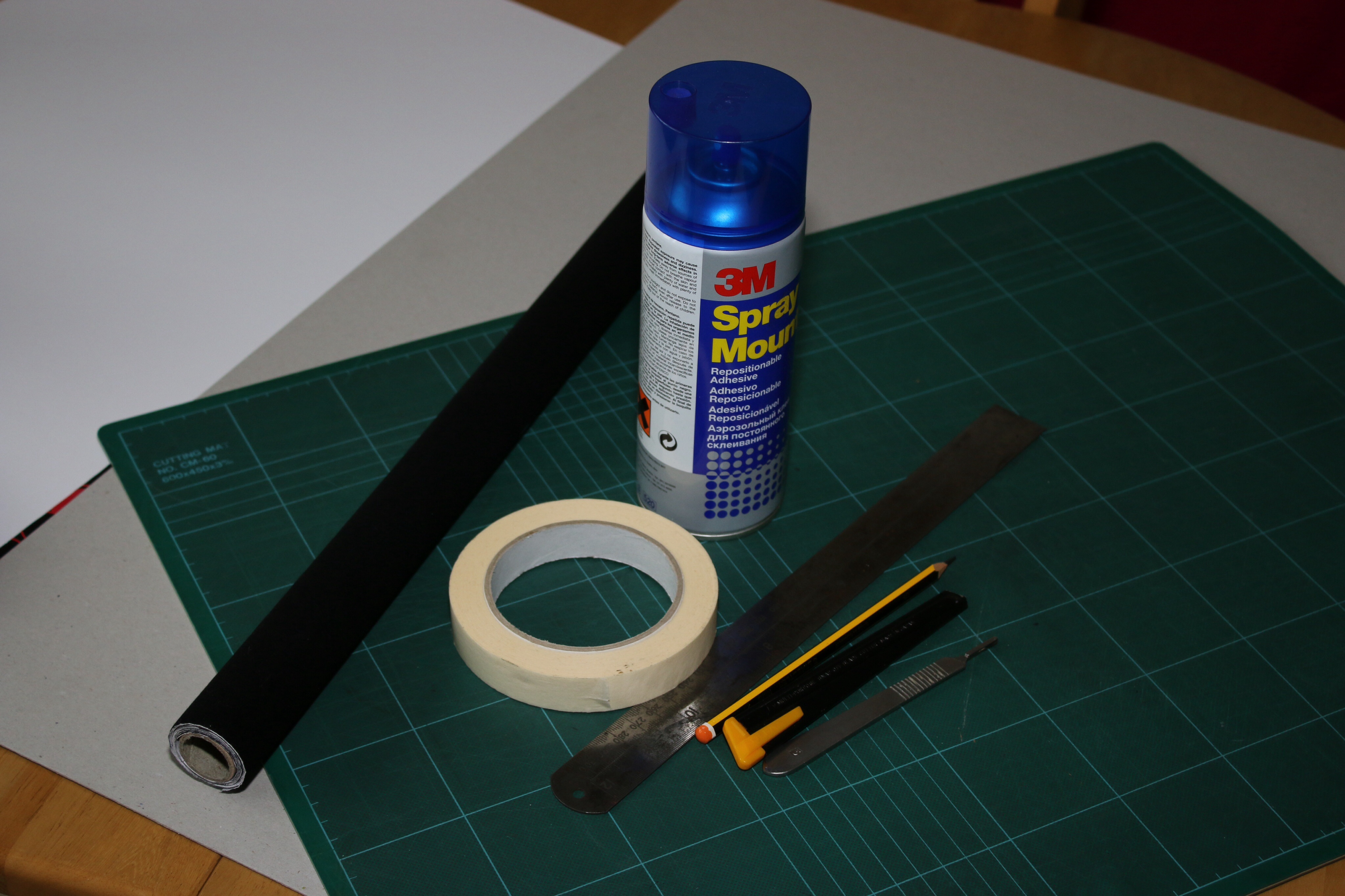 A sheet of Rigid pulp board: I’m using a grey board which has a black coating on one side. The material needs to be between 1 & 2mm thick (1000-2000mic or 0.04-0.08″). One side of the board will be visible on the inside, so you can coat this or use a coloured or pre-coated material as I am, but these boards can be expensive so a solid grey or display board can also be used.