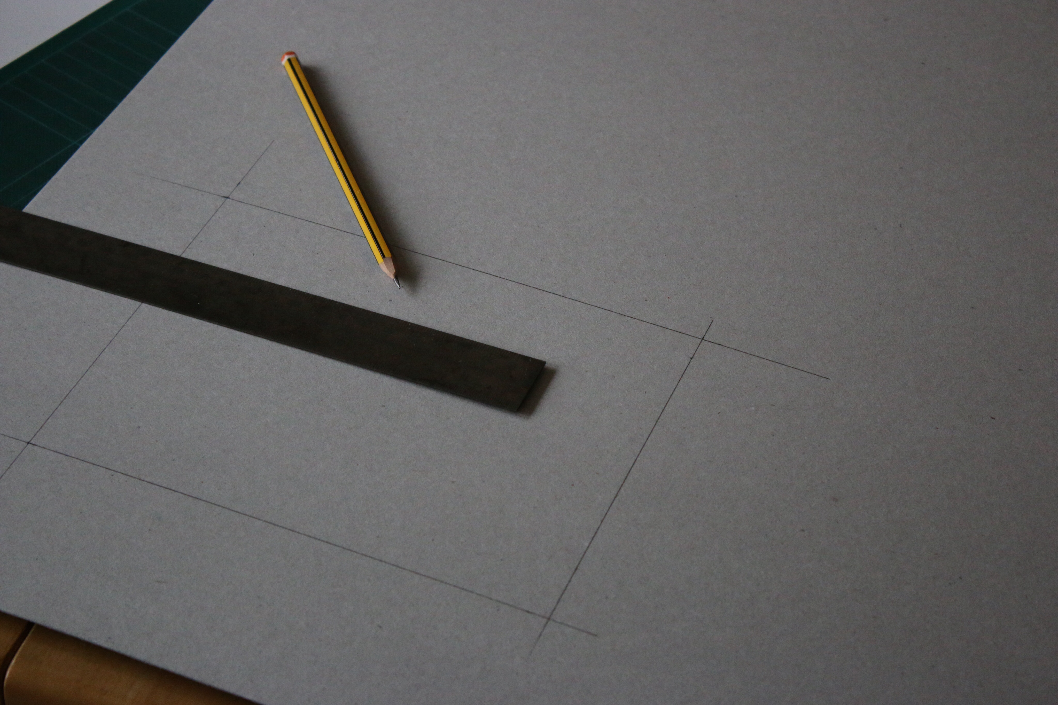 Start by joining the dots to form a rectangle. Then mark diagonal lines outwards from each corner about 25mm (1″) long. The long sides of the paper, will wrap up and around the corners onto the short edges by about 15-20mm. The diagonal lines form the start of these new flaps.