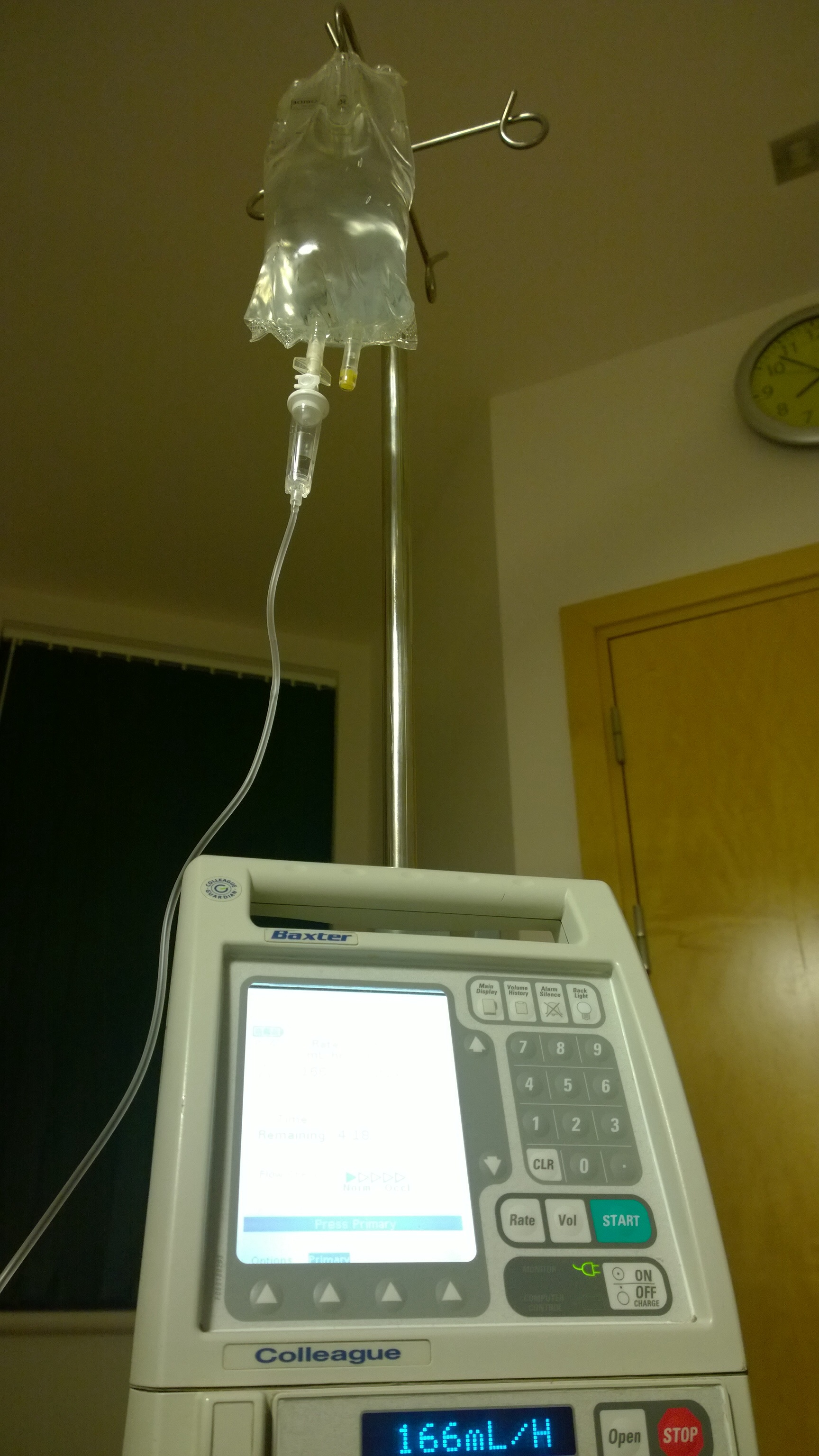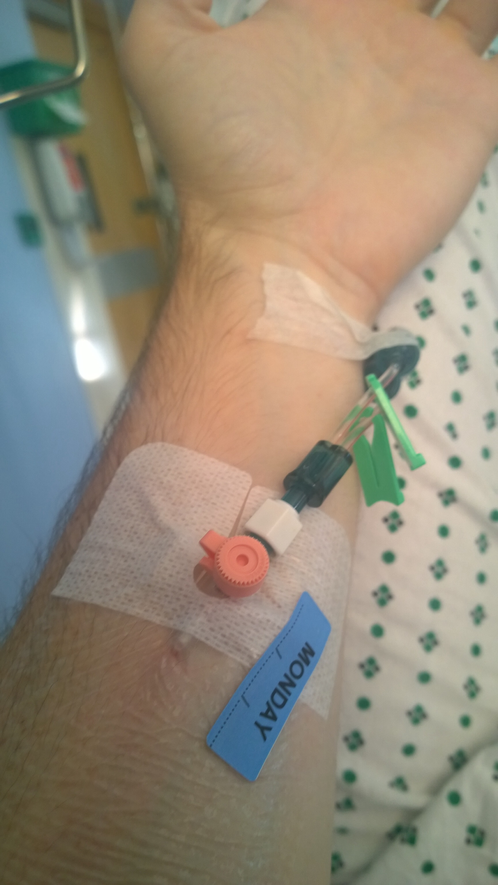 From about midnight on the night before I was told not to eat or drink in preparation for the procedure. I was taken through to the operating room and asked to lie on the bench. The anaesthetist started to shave my chest while her colleague inserted a catheter into my wrist. She cleaned the area and then applied 3 doses of anaesthetic in a triangle from my neck around the right side of my chest. As the anaesthetic started to react, they applied a mild sedative (to help relax me noting that I still had my severe headache) via the catheter, and prepared the area by applying shields taped to my chest and face so that I couldn’t see the operation (and presumably to collect blood spray). They started by making incisions to the top of my neck either side of my collar bone. She passed a needle through the opening and into a vein which passes from my neck down under my chest into my heart. A guide wire is passed through the needle and advanced into the vein. A vein dilator is then passed over the wire to hold the vein open and make a seal. At this point the performed an x-Ray to check the position. I was fairly drowsy at this point, but was aware of what was going on. The staff reassured me as I went, telling me when to expect tugging and pulling, and talked me through the steps. Next they made an incision into my chest and passed the line just under the surface of the skin up to the site of the guide wire. The line was pushed into position and the guide wire was removed. The pulling and tugging at this stage was fairly strong and although I could feel what was happening, there was no pain, it was just a tugging sensation. After a few minutes, the entry and exit sites were stitched closed and a dressing was applied. The anaesthetist instructed her colleague to reverse the effect of sedation and another fluid was applied to my catheter. I became much more lucid and awake at this point and I could feel my headache again. I was sent back to my bed for a short while. A few minutes later a porter arrived to take me for a chest X-ray. 30 minutes later the doctor confirmed the line was in the correct place and was ready to use. The whole process probably took an hour and I was surprised how quickly it was ready for use. I was expecting to feel pain as the anaesthetic wore off, but the pain was no greater than a small cut. My collar bone was a little swollen and was a little tender for the next couple of days and it’s taken me a while to get used to sleeping with the line in. The top stitches will come out tomorrow (after 5 days) which I’m looking forward to as they’re starting to rub a little. The stitch at the exit site will be removed after 2 weeks. I have also had a bit of an allergic reaction to the dressing which has made the area a little red and itchy, but this is manageable. Re-dressing tomorrow should help relieve this.